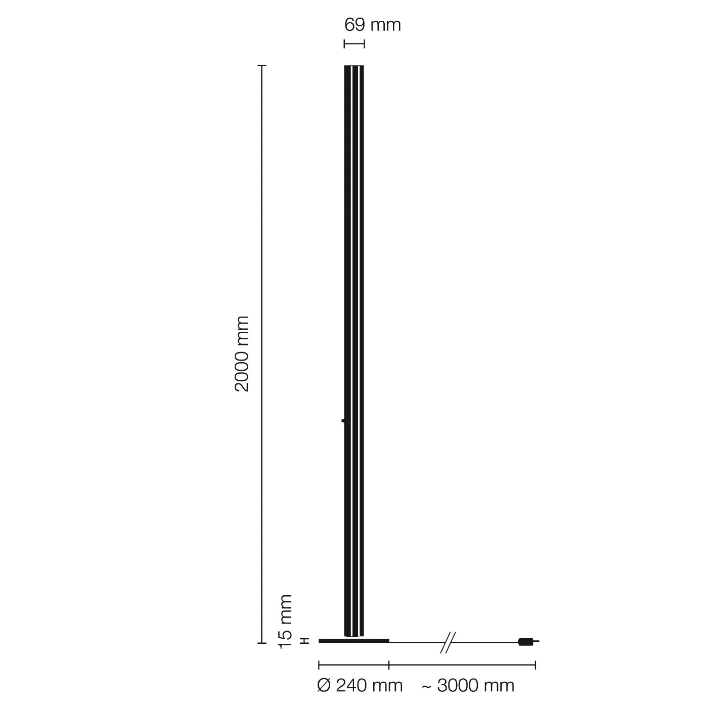 | Abmessungen | Höhe 2 m, Standrohrdurchmesser 6,9 cm, Fußdurchmesser 24 cm, Kabellänge 3 m, Gewicht 10,6 kg. |
